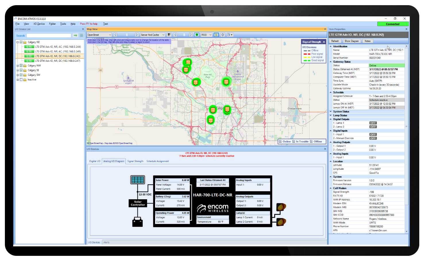 ATMOS shows the location and status of all Encom cellular sites all in one platform. Whether you are monitoring remote solar locations, flood warning beacons, advanced warning systems, school zone flashing beacons or just the cellular modem. ATMOS allows you to configure, control and monitor these applications from anywhere.