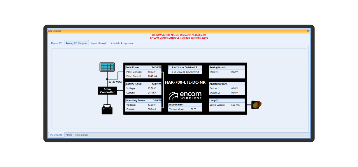 Solar Panel Output Voltage can be monitored from a central location, you can see exactly how much power each and every solar array is generating at any time during the day. This information is displayed in real time, and also logged for historical comparison. The Diagnostic window also contains the Digital IO, Signal Strength and Schedule Assignment windows.